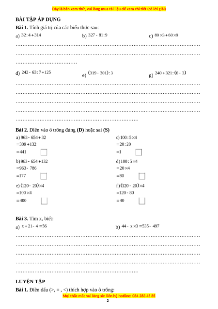 Bài 3. Tính giá trị các biểu thức sau: a) d) b) e) c) f) Bài 4. Tìm x, biết: a) b) c) d) e) f)