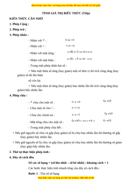 KIẾN THỨC CẦN NHỚ 1. Phép Cộng : 2. Phép trừ : 3. Phép nhân : - Nhân với : - Nhân với : - Nhân với một tổng : - Nhân với một hiệu :