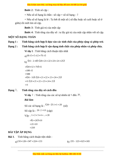 Ví dụ : Tính tổng của các số tự nhiên từ đến . Bài làm Số các số hạng là : (số) Số cặp là : (cặp) Vậy : BÀI TẬP ÁP DỤNG