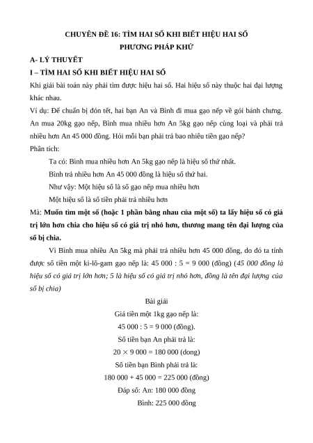CHUYÊN ĐỀ 16: TÌM HAI SỐ KHI BIẾT HIỆU HAI SỐ PHƯƠNG PHÁP KHỬ A- LÝ THUYẾT