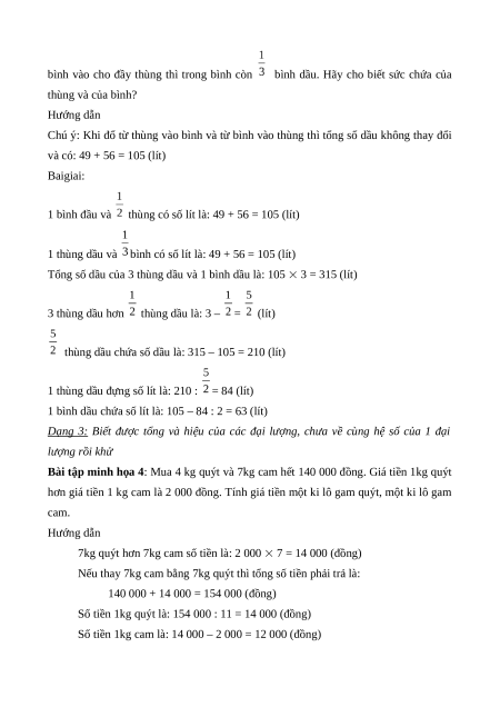 bình vào cho đầy thùng thì trong bình còn bình dầu. Hãy cho biết sức chứa của thùng và của bình? Hướng dẫn