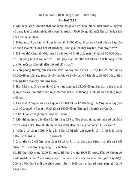Trả lời: Giá tiền một quyển sách là ... đồng.