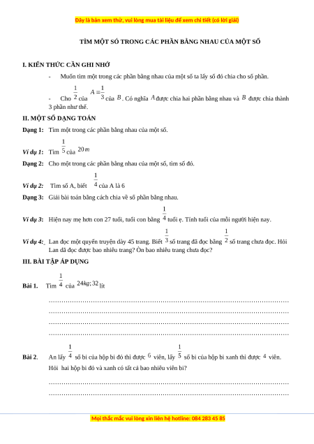 Dạng 1: Tìm một trong các phần bằng nhau của một số.