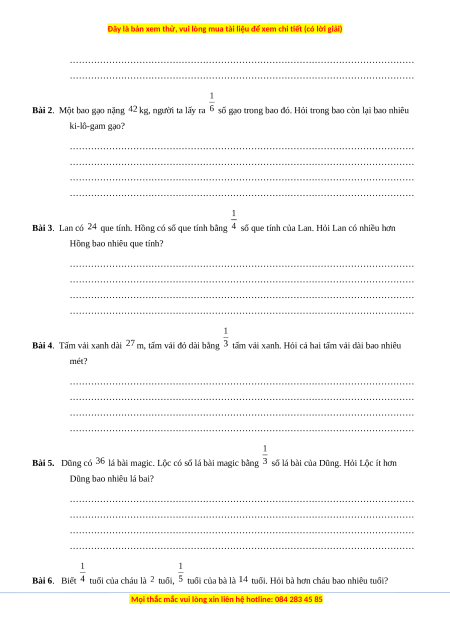 Bài 6. Biết tuổi của cháu là tuổi, tuổi của bà là tuổi. Hỏi bà hơn cháu bao nhiêu tuổi?