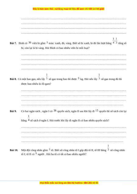 Bài 7. Bình có viên bi gồm màu: xanh, đỏ, vàng. Biết số bi xanh, bi đỏ lần lượt bằng tổng số
