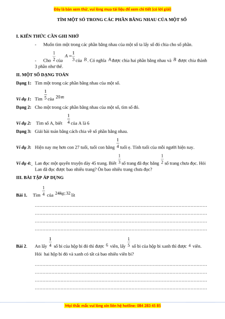 Dạng 1: Tìm một trong các phần bằng nhau của một số.