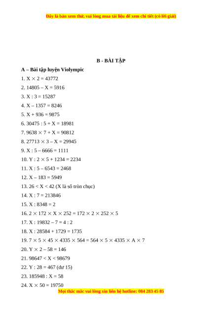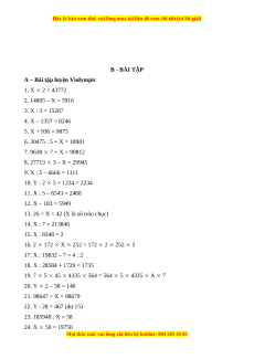 A – Bài tập luyện Violympic 1. X 2 = 43772 2. 14805 – X = 5916 3. X : 3 = 15287 4. X – 1357 = 8246 5. X + 936 = 9875 6. 30475 : 5 + X = 18981 7. 9638 7 + X = 90812 8. 27713 3 – X = 29945 9. X : 5 – 6666 = 1111 10. Y : 2 5 + 1234 = 2234 11. X : 5 – 6543 = 2468 12. X – 183 = 5949