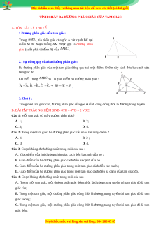 ỗ tam giác có mấy đư ng ờ phân giác? A. 1; B. 2; C. 3; D. 4. Câu 2: Trong m t ộ tam giác, ba đư ng phâ ờ n giác c t ắ nhau t i ạ m y đi ấ m ể ? A. 1; B. 2 ; C. 3; D. 4. Câu 3: Ch n kh ọ ẳng đ nh đúng nh ị ất trong m i ỗ câu sau : A. Giao điểm c a ủ hai đư ng phâ ờ n giác cách đ u ba ề cạnh c a ủ nó ; B. Giao đi m ể c a ủ ba đư ng ờ phân giác cách đ u ba ề cạnh của nó ; C. Giao điểm c a ủ ba đư ng phâ ờ n giác trong m t ộ tam giác cách đ u c ề ác c nh ạ ; D. Giao điểm c a ủ ba đư ng phâ ờ n giác trong m t ộ tam giác cách đ u ba ề c nh c ạ a ủ tam giác đó. Câu 4: Ch n kh ọ ẳng đ nh đúng nh ị ất trong mỗi câu sau :