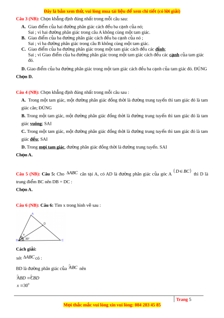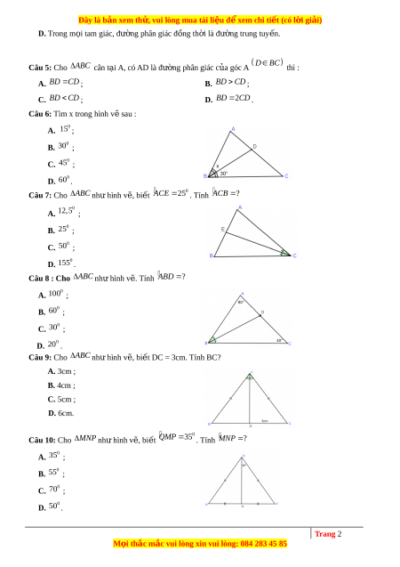 Đây là bản xem th , vu ử i lòng mua tài li u ệ đ xe ể m chi ti t ế (có l i ờ gi i ả ) D. Trong m i ọ tam giác, đư ng ờ phân giác đ ng t ồ hời là đư ng t ờ rung tuy n. ế D BC Câu 5: Cho AB