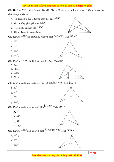 ư nh vẽ, biết IK =5cm. Tính IG ? A. 5cm ; B. 10cm ; C. 15cm ; D. 20cm. Câu 14: Cho E D F cân tại D nh hì ư nh v , bi ẽ t ế 0 IEF 34 . Tính EDF ? A. 0 30 ; B. 0 44 ; C. 0 68 ; D. 0 150 . 0 Câu 15: Cho E D E 25 F nh hì ư nh vẽ, biết 1 . Tính EDF ? A. 0 25 ; B. 0 50 ; C. 0 80 ; D. 0 100 . 0 0 Câu 16: Cho ABC nh hì ư nh vẽ, biết A 35 ; B 2 0 1 1 . Tính ACB ? A. 0 40 ; B. 0 55 ; C. 0 125 ; Trang 3 M i