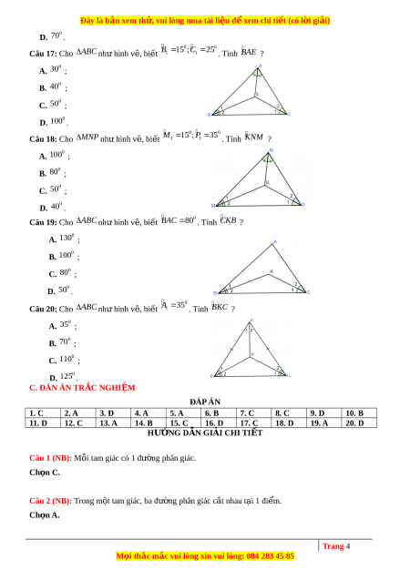 Đây là bản xem th , vu ử i lòng mua tài li u ệ đ xe ể m chi ti t ế (có l i ờ gi i ả ) D. 0 70 . 0 0 Câu 17: Cho ABC nh hì ư nh vẽ, biết B 15 ;C 2 5 1 1 . Tính BAE ? A. 0 30 ; B. 0 40 ; C. 0 50 ; D. 0 100 . 0 0 Câu 18: Cho M NP nh hì ư nh vẽ, biết M 1 5 ; P 35 1 1 . Tính KNM ? A. 0 100 ; B. 0 80 ; C. 0 50 ; D. 0 40 . Câu 19: Cho ABC nh hì ư nh vẽ, biết 0 BAC 8 0 . Tính CKB ? A. 0 130 ; B. 0 100 ; C. 0 80 ; D. 0 50 . 0 Câu 20: Cho ABC nh hì ư nh vẽ, biết A 35 1 . Tính BKC ? A. 0 35 ; B. 0 70 ; C. 0 110 ; D. 0 125 . C. ĐÁN ÁN TR C Ắ NGHI M Ệ ĐÁP ÁN 1. C 2. A 3. D 4. A 5. A 6. B 7. C 8. C 9. D 10. B 11. D 12. C 13. A 14. B 15. C 16. D 17. C 18. D 19. A 20. D HƯ N Ớ G D N Ẫ GI I Ả CHI TI T Ế Câu 1 (NB): M i