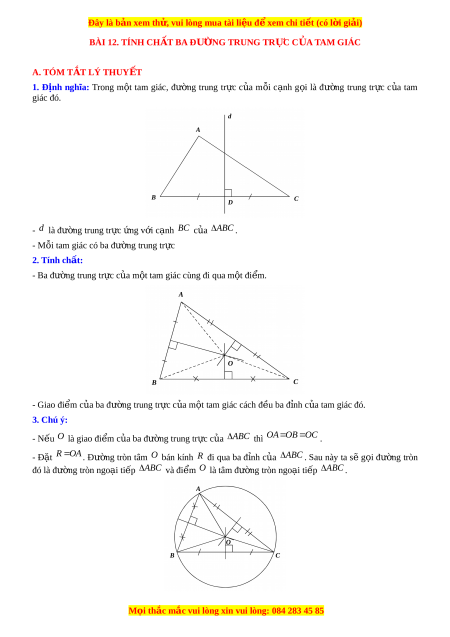 Đây là bản xem th , vu ử i lòng mua tài li u ệ đ xe ể m chi ti t ế (có l i ờ gi i ả ) BÀI 12. TÍNH CH T Ấ BA ĐƯ N Ờ G TRUNG TR C Ự C A Ủ TAM GIÁC A. TÓM T T Ắ LÝ THUY T Ế