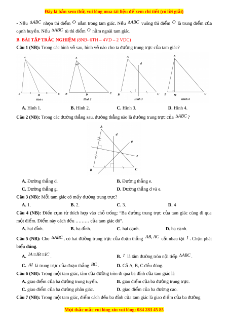 ỗ tam giác có mấy đư ng ờ trung tr c ự ? A. 1. B. 2. C. 3. D. 4 Câu 4 (NB): Đi n ề c m ụ từ thích h p ợ vào chỗ tr ng ố : “Ba đư ng ờ trung tr c ự c a ủ tam giác cùng đi qua m t ộ đi m ể . Đi m