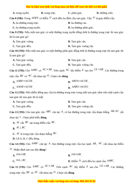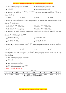 ậ O là giao điểm của A. ba đư ng t ờ rung trực. B. ba đư ng c ờ ao. C. ba đư ng t ờ rung tuy n. ế D. ba đư ng ờ phân giác. Câu 9 (TH): N u ế một tam giác có m t ộ đư ng ờ trung tuy n ế đ ng ồ th i ờ là đư ng ờ trung tr c ự thì tam giác đó là tam giác gì? A. Tam giác vuông. B. Tam giác cân. C. Tam giác đều.