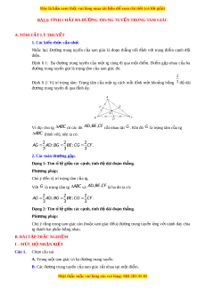 Đây là bản xem th , vu ử i lòng mua tài li u ệ đ xe ể m chi ti t ế (có l i ờ gi i ả ) BÀI 4: TÍNH CH T Ấ BA ĐƯ N Ờ G TRUNG TUY N Ế TRONG TAM GIÁC A. TÓM T T Ắ LÝ THUY T Ế 1. Các ki n ế th c ứ c n ầ nh . ớ Nhắc lại: Đư ng ờ trung tuy n ế c a ủ tam giác là đo n ạ th ng ẳ n i ố đ nh ỉ v i ớ trung đi m ể c nh ạ đ i ố di n. ệ Đ nh ị lí 1: Ba đư ng ờ trung tuy n ế c a ủ m t ộ tg cùng đi qua m t ộ đi m ể . Đi m ể g p ặ nhau c a ủ ba đư ng t ờ rung tuy n g ế i ọ là tr ng ọ tâm của tam giác đó. 2 Đ nh ị lí 2: Vị trí tr ng ọ tâm: Tr ng ọ tâm c a ủ m t ộ tg cách m i ỗ đ nh ỉ m t ộ kho ng ả b ng ằ 3 độ dài đư ng t ờ rung tuy n đi ế qua đ nh ỉ y ấ . Ví d : ụ cho tg A BC có các dtt D