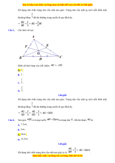 Tam giác ABCcó trung tuyến AM 1 5cmvà tr ng ọ tâm G . Đ dà ộ i đoạn AG là: A. 7,5cm . B. 5cm . C. 10cm . D. 22,5cm . L i ờ giải AG 2 AG 1 0cm S d ử ng ụ tính chất tr ng ọ tâm c a ủ m t ộ tam giác ta có AM 3 . M i
