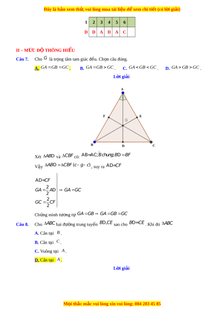 Đây là bản xem th , vu ử i lòng mua tài li u ệ đ xe ể m chi ti t ế (có l i ờ gi i ả ) 1 2 3 4 5 6 D D A D A C II – M C Ứ Đ Ộ THÔNG HI U Ể Câu 7. Cho G là tr ng t ọ âm tam giác đ u. Ch ề n c ọ âu đúng.