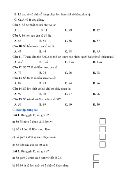 Câu 15. Số nào dưới đây bé hơn số 51? A. 56 B. 89 C. 69 D. 39 C. Bài tập đúng sai