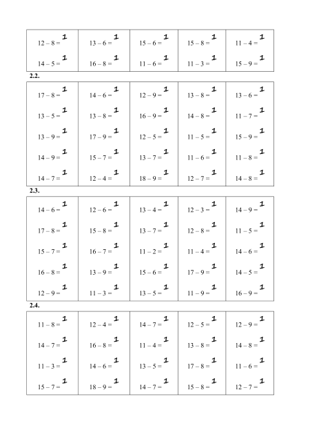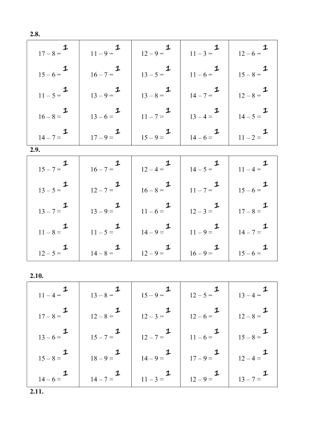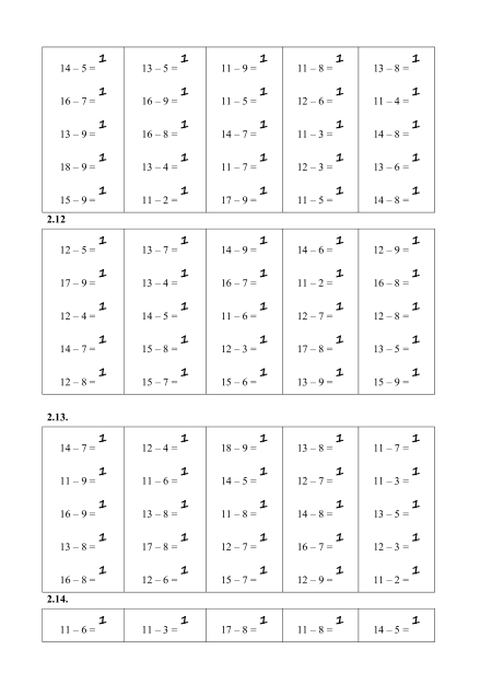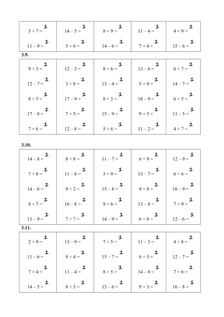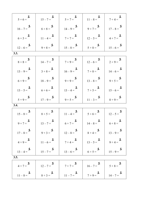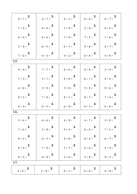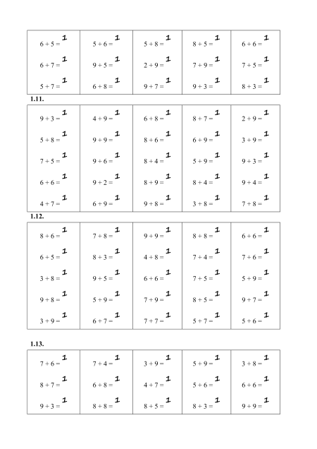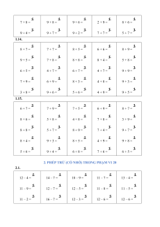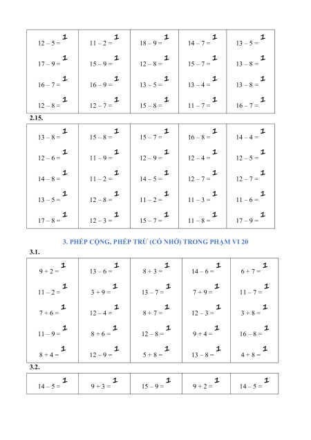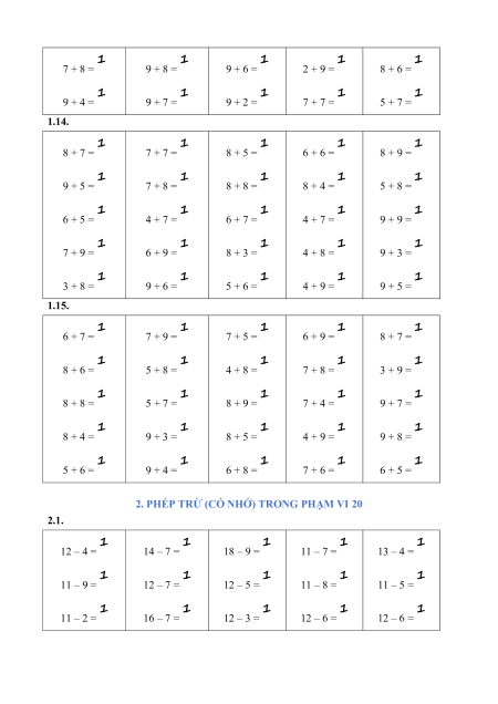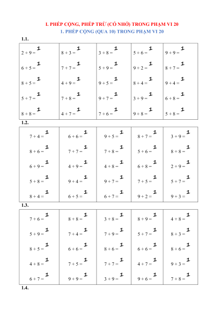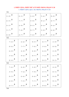 1. PHÉP CỘNG (QUA 10) TRONG PHẠM VI 20 1.1. 1 1 1 1 1 2 + 9 = 8 + 3 = 3 + 8 = 5 + 6 = 9 + 9 = 1 1 1 1 1 6 + 5 = 7 + 7 = 5 + 9 = 9 + 2 = 8 + 7 = 1 1 1 1 1 8 + 5 = 4 + 9 = 9 + 5 = 8 + 4 = 9 + 4 = 1 1 1 1 1 5 + 7 = 7 + 8 = 9 + 7 = 3 + 9 = 6 + 8 = 1 1 1 1 1 8 + 8 = 4 + 7 = 7 + 6 = 9 + 8 = 5 + 8 = 1.2. 1 1 1 1 1 7 + 4 = 6 + 6 = 9 + 5 = 8 + 7 = 3 + 9 = 1 1 1 1 1 8 + 6 = 7 + 7 = 7 + 8 = 5 + 6 = 8 + 8 = 1 1 1 1 1 6 + 9 = 4 + 9 = 4 + 8 = 6 + 8 = 2 + 9 = 1 1 1 1 1 5 + 8 = 9 + 4 = 9 + 7 = 7 + 5 = 5 + 7 = 1 1 1 1 1 8 + 4 = 6 + 5 = 6 + 7 = 9 + 2 = 9 + 3 = 1.3. 1 1 1 1 1 7 + 6 = 8 + 8 = 3 + 8 = 8 + 9 = 4 + 8 = 1 1 1 1 1 5 + 9 = 7 + 4 = 7 + 9 = 5 + 7 = 8 + 3 = 1 1 1 1 1 8 + 5 = 6 + 6 = 8 + 6 = 6 + 6 = 8 + 6 = 1 1 1 1 1 4 + 8 = 7 + 5 = 7 + 7 = 4 + 7 = 9 + 3 = 1 1 1 1 1 6 + 7 = 9 + 9 = 3 + 9 = 9 + 6 = 7 + 8 = 1.4. 1 1 1 1 1 9 + 7 = 4 + 7 = 8 + 3 = 8 + 4 = 8 + 7 = 1 1 1 1 1 7 + 8 = 6 + 6 = 3 + 9 = 2 + 9 = 6 + 8 = 1 1 1 1 1 4 + 9 = 8 + 6 = 7 + 9 = 7 + 5 = 7 + 6 = 1 1 1 1 1 3 + 8 = 6 + 5 = 6 + 7 = 9 + 8 = 4 + 7 = 1 1 1 1 1 7 + 4 = 9 + 3 = 9 + 2 = 8 + 8 = 5 + 9 = 1.5. 1 1 1 1 1 9 + 4 = 7 + 7 = 8 + 6 = 8 + 4 = 3 + 9 = 1 1 1 1 1 7 + 5 = 5 + 7 = 9 + 8 = 6 + 7 = 8 + 8 = 1 1 1 1 1 4 + 8 = 2 + 9 = 5 + 8 = 5 + 9 = 9 + 6 = 1 1 1 1 1 9 + 5 = 7 + 8 = 8 + 7 = 9 + 7 = 7 + 4 = 1 1 1 1 1 8 + 9 = 8 + 5 = 6 + 9 = 8 + 3 = 6 + 8 = 1.6. 1 1 1 1 1 5 + 6 = 6 + 6 = 4 + 9 = 4 + 7 = 3 + 8 = 1 1 1 1 1 7 + 6 = 3 + 9 = 9 + 2 = 8 + 8 = 7 + 5 = 1 1 1 1 1 9 + 3 = 6 + 5 = 9 + 8 = 9 + 4 = 6 + 7 = 1 1 1 1 1 9 + 9 = 7 + 9 = 5 + 7 = 8 + 6 = 5 + 9 = 1 1 1 1 1 8 + 5 = 8 + 9 = 5 + 6 = 5 + 8 = 9 + 5 = 1.7. 1 1 1 1 1 3 + 8 = 2 + 9 = 8 + 7 = 6 + 8 = 8 + 9 = 1 1 1 1 1 7 + 6 = 8 + 4 = 6 + 5 = 8 + 5 = 8 + 6 = 1 1 1 1 1 9 + 2 = 9 + 9 = 8 + 3 = 5 + 7 = 7 + 8 = 1 1 1 1 1 9 + 5 = 9 + 8 = 6 + 6 = 4 + 9 = 4 + 8 = 1 1 1 1 1 6 + 7 = 7 + 4 = 4 + 7 = 7 + 9 = 3 + 9 = 1.8. 1 1 1 1 1 9 + 9 = 8 + 8 = 7 + 9 = 9 + 7 = 7 + 4 = 1 1 1 1 1 9 + 6 = 7 + 5 = 8 + 4 = 5 + 8 = 5 + 9 = 1 1 1 1 1 9 + 4 = 5 + 7 = 5 + 6 = 9 + 4 = 8 + 5 = 1 1 1 1 1 9 + 8 = 9 + 3 = 3 + 9 = 9 + 6 = 7 + 6 = 1 1 1 1 1 9 + 7 = 5 + 8 = 3 + 8 = 8 + 3 = 7 + 7 = 1.9. 1 1 1 1 1 5 + 9 = 6 + 5 = 6 + 6 = 8 + 7 = 7 + 4 = 1 1 1 1 1 6 + 9 = 8 + 8 = 4 + 8 = 9 + 7 = 9 + 2 = 1 1 1 1 1 8 + 3 = 8 + 9 = 7 + 4 = 4 + 7 = 5 + 8 = 1 1 1 1 1 8 + 6 = 8 + 4 = 7 + 7 = 6 + 7 = 9 + 5 = 1 1 1 1 1 7 + 8 = 4 + 9 = 7 + 6 = 2 + 9 = 6 + 8 = 1.10. 1 1 1 1 1 4 + 7 = 9 + 4 = 7 + 6 = 8 + 8 = 8 + 6 = 1 1 1 1 1 9 + 6 = 7 + 7 = 6 + 6 = 8 + 7 = 4 + 8 = 1 1 1 1 1 6 + 5 = 5 + 6 = 5 + 8 = 8 + 5 = 6 + 6 = 1 1 1 1 1 6 + 7 = 9 + 5 = 2 + 9 = 7 + 9 = 7 + 5 = 1 1 1 1 1 5 + 7 = 6 + 8 = 9 + 7 = 9 + 3 = 8 + 3 = 1.11. 1 1 1 1 1 9 + 3 = 4 + 9 = 6 + 8 = 8 + 7 = 2 + 9 = 1 1 1 1 1 5 + 8 = 9 + 9 = 8 + 6 = 6 + 9 = 3 + 9 = 1 1 1 1 1 7 + 5 = 9 + 6 = 8 + 4 = 5 + 9 = 9 + 3 = 1 1 1 1 1 6 + 6 = 9 + 2 = 8 + 9 = 8 + 4 = 9 + 4 = 1 1 1 1 1 4 + 7 = 6 + 9 = 9 + 8 = 3 + 8 = 7 + 8 = 1.12. 1 1 1 1 1 8 + 6 = 7 + 8 = 9 + 9 = 8 + 8 = 6 + 6 = 1 1 1 1 1 6 + 5 = 8 + 3 = 4 + 8 = 7 + 4 = 7 + 6 = 1 1 1 1 1 3 + 8 = 9 + 5 = 6 + 6 = 7 + 5 = 5 + 9 = 1 1 1 1 1 9 + 8 = 5 + 9 = 7 + 9 = 8 + 5 = 9 + 7 = 1 1 1 1 1 3 + 9 = 6 + 7 = 7 + 7 = 5 + 7 = 5 + 6 = 1.13. 1 1 1 1 1 7 + 6 = 7 + 4 = 3 + 9 = 5 + 9 = 3 + 8 = 1 1 1 1 1 8 + 7 = 6 + 8 = 4 + 7 = 5 + 6 = 6 + 6 = 1 1 1 1 1 9 + 3 = 8 + 8 = 8 + 5 = 8 + 3 = 9 + 9 =