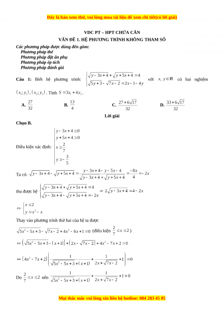 VẤN ĐỀ 1. HỆ PHƯƠNG TRÌNH KHÔNG THAM SỐ