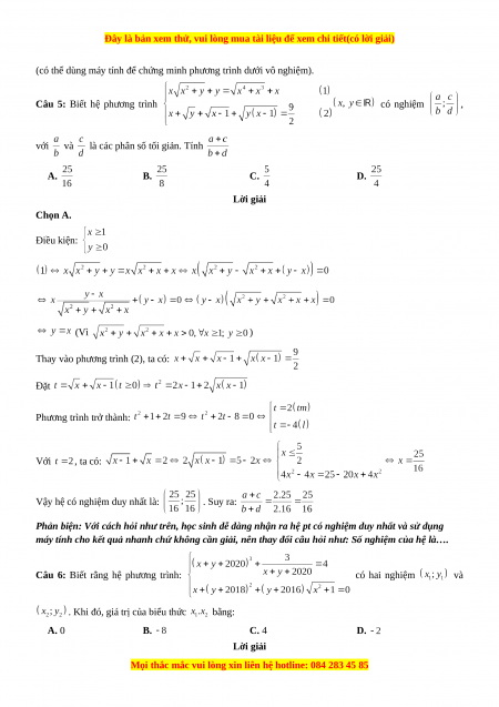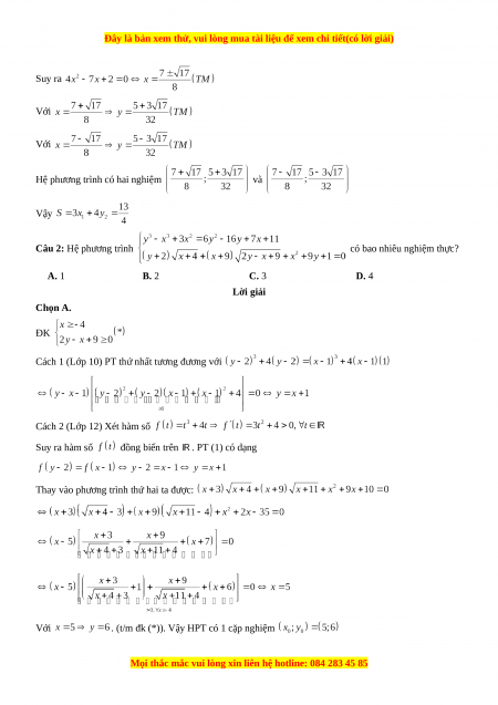 Câu 1: Biết hệ phương trình: với có hai nghiệm . Tính . A. B. C. D. Lời giải Chọn B. Điều kiện xác định: Ta có: thu được hệ