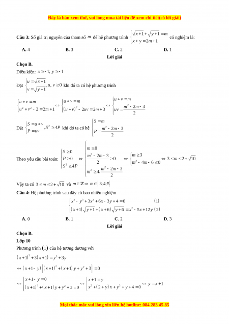 Câu 3: Số giá trị nguyên của tham số để hệ phương trình có nghiệm là: A. 4 B. 3 C. 2 D. 1 Lời giải Chọn B. Điều kiện: Đặt