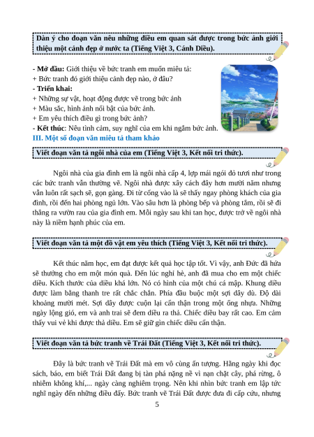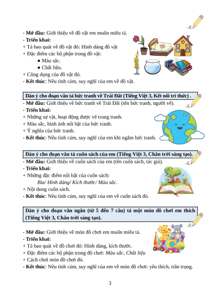 - Tailieugiaovien.com.vn giới thiệu Chuyên đề Văn miêu tả lớp 3 chương trình sách mới nhằm hướng dẫn chi tiết cách viết đoạn văn miêu tả lớp 3 (khái niệm, lưu ý, dàn ý các dạng, các bài văn mẫu) có trong chương trình Tiếng Việt lớp 3.
