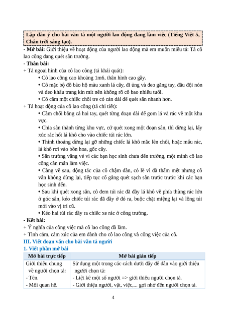 - Mở bài: Giới thiệu về hoạt động của người lao động mà em muốn miêu tả: Tả cô