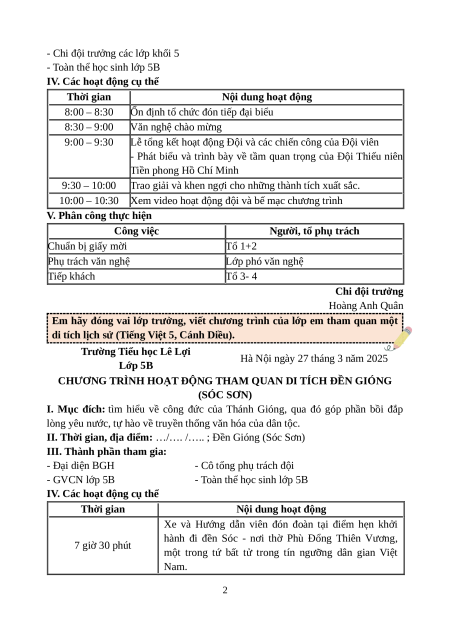 Em hãy đóng vai chi đội trưởng, viết chương trình hoạt động của chi đội kỉ