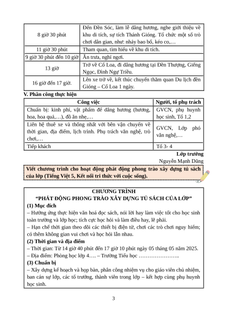 thời gian, địa điểm, lịch trình. Phụ trách văn nghệ, trò văn nghệ,… chơi,… Tiếp khách Tổ 3- 4 Lớp trưởng Nguyễn Mạnh Dũng