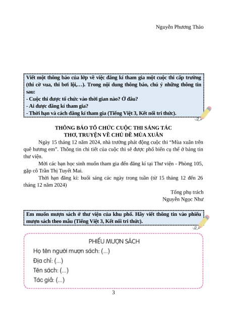 Em hãy nhắn bạn mang cho mình mượn cuốn truyện (Tiếng Việt 3, Kết nối tri thức). Thương thân yêu,