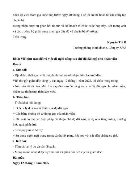 Đề 1: Viết thư trao đổi về việc tổ chức một cuộc họp công ty Dàn ý a. Mở bài: