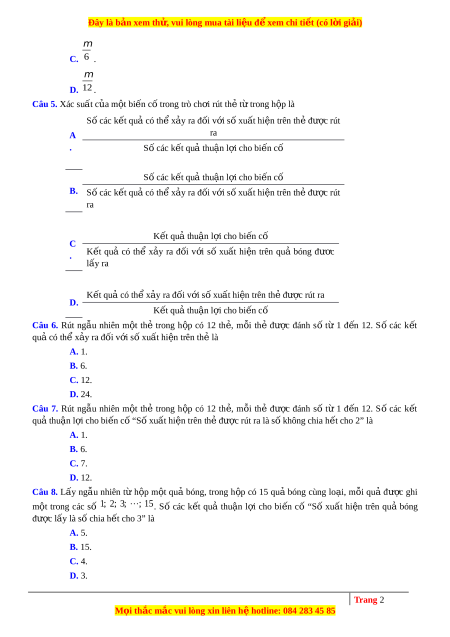 Câu 4. Trong trò chơi gieo ng u ẫ nhiên xúc x c ắ m t ộ l n, ầ n u ế m là số các k t ế quả thu n ậ l i ợ cho bi n ế cố thì xác suất c a ủ bi n ế c đó b ố ng ằ A. m. B. 6m. M i ọ thắc m c