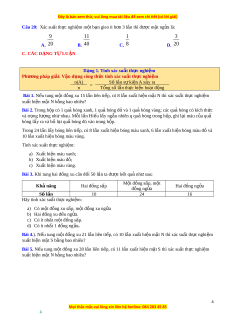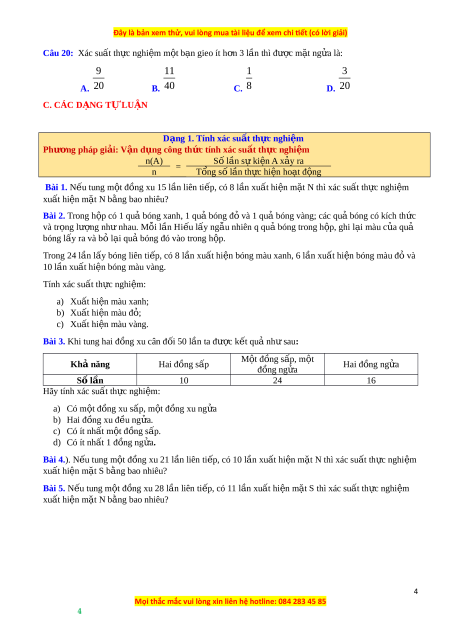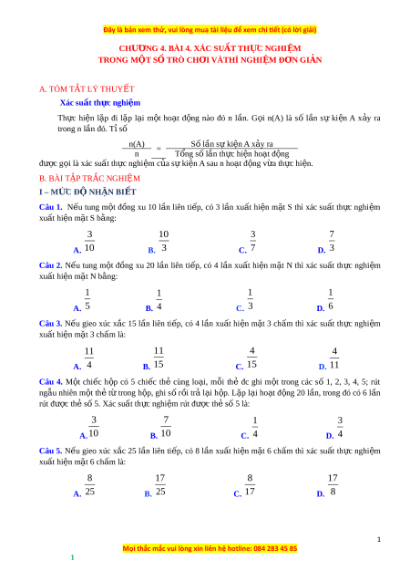CHƯƠNG 4. BAI 4. XAC SU T Â TH C Ư NGHI M Ê TRONG M T Ô S Ô TRO CH I Ơ VATHI NGHI M Ê Đ N Ơ GI N A A. TÓM T T Ắ LÝ THUY T Ế Xác suất th c ự nghi m ệ Thực hi n ệ l p ặ đi l p ặ l i ạ m t ộ ho t ạ đ ng ộ nào đó n l n. ầ G i ọ n(A) là số l n ầ sự ki n ệ A x y ả ra trong n lần đó. T s ỉ ố n(A) S l ố ần s ki ự ện A xảy ra = n T ng ô s l ố ần th c ự hi n ệ hoạt đ ng ộ đư c ơ g i ọ là xac suât th c ự nghi m ệ c a u s ki ự n ệ A sau n ho t ạ đ ng v ộ a ư th c ự hi n. ệ B. BÀI T P Ậ TR C N Ắ GHI M Ệ I – MỨC ĐÔ NH N Ậ BI T Ế Câu 1. Nếu tung m t ộ đ ng ồ xu 10 l n ầ liên ti p, ế có 3 l n ầ xu t â hi n ệ m t ặ S thì xac su t â th c ự nghi m ệ xuât hi n m ệ ặt S bằng: 3 10 3 7