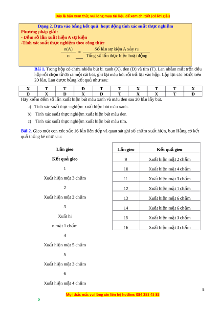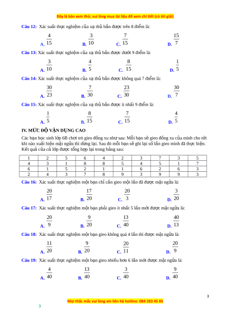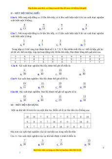 A. 5 B. 15 C. 15 D. 5 IV. MỨC ĐÔ V N Ậ D N Ụ G CAO Cac bạn h c ọ sinh l p 6 ớ B chơi trò gieo đ ng xu nh ồ ư sau: M i ỗ bạn s gi ẽ eo đ ng ồ xu c a u mình cho tới khi nào xuât hi n m ệ ặt ng a ử thì d ng ư l i ạ . Sau đó m i ỗ b n s ạ ghi ẽ l i ạ s l ố n gi ầ eo mình đã th c ự hi n. ệ Kết quả c a u cả l p ớ đư c ơ t ng h ô p ơ lại trong bảng sau: 1 2 5 6 4 2 3 7 3 5 4 3 1 8 8 5 4 5 1 7 6 1 5 2 1 1 6 2 6 3 2 4 3 7 8 9 3 9 9 3
