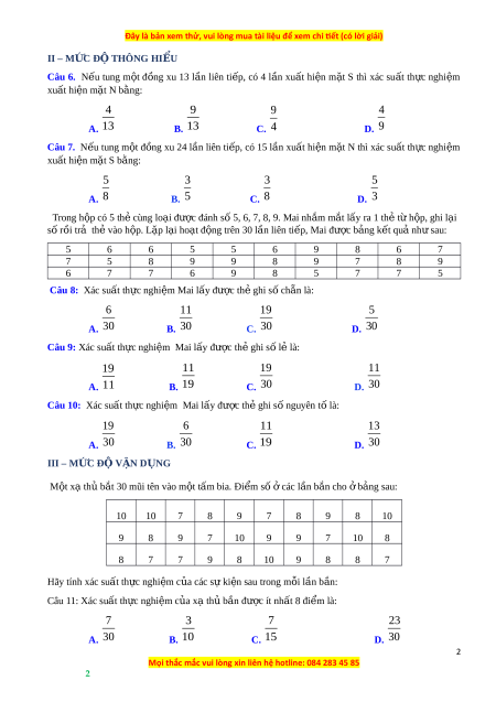 ộ xạ thu bắt 30 mũi tên vào một tâm bia. Đi m ể s ố c ở ac lần bắn cho b ở ảng sau: 10 10 7 8 9 7 8 9 8 10 9 8 9 7 10 9 9 7 10 8 8 7 7 9 8 10 9 8 8 7 Hãy tính xac suât th c ự nghi m ệ cua cac s ki ự n s ệ au trong m i ỗ lần b n: ắ Câu 11: Xac suât th c ự nghi m ệ cua xạ th b u ắn đư c ơ ít nhât 8 điểm là: 7 3 7 23