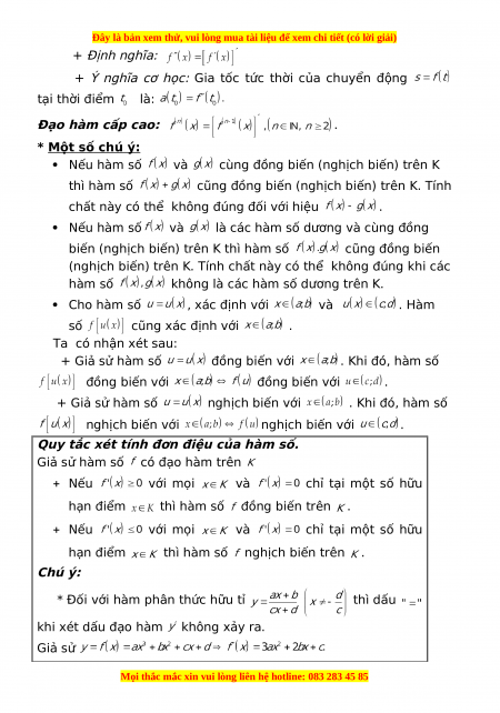 + Ý nghĩa cơ học: Gia tốc tức thời của chuyển động tại thời điểm là: Đạo hàm cấp cao: . * Một số chú ý: Nếu hàm số và
