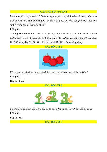 Có ba quả táo trên bàn và bạn lấy đi hai quả. Hỏi bạn còn bao nhiêu quả táo? Lời giải: Đáp án: 2 quả CÂU ĐỐ VUI 6