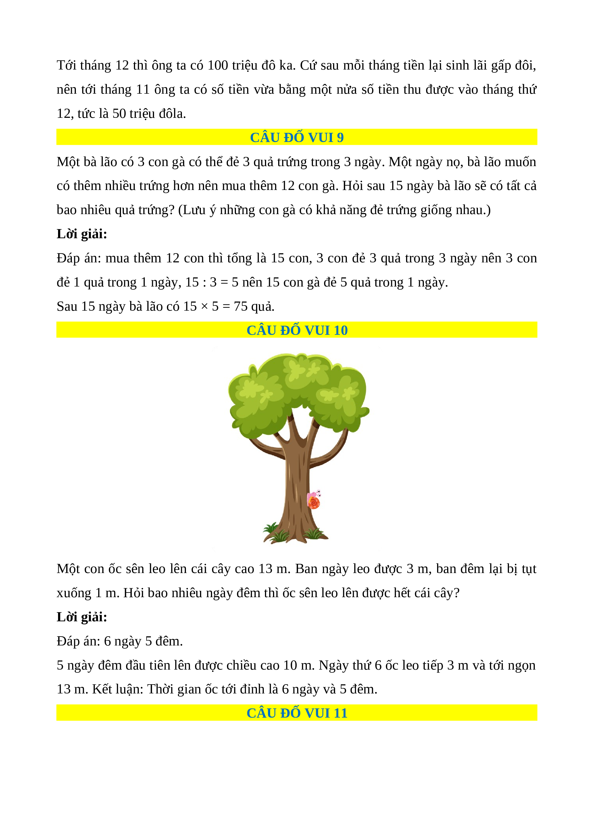 13 m. Kết luận: Thời gian ốc tới đỉnh là 6 ngày và 5 đêm. CÂU ĐỐ VUI 11