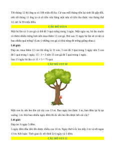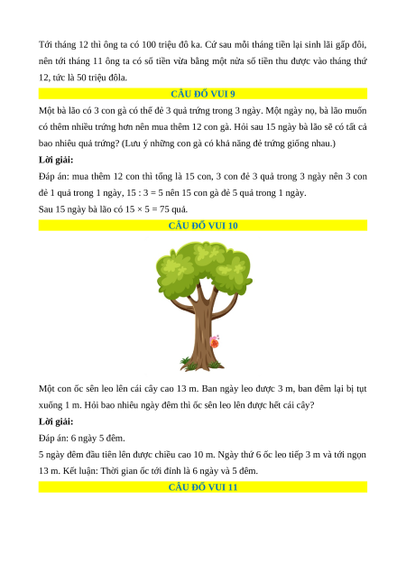 xuống 1 m. Hỏi bao nhiêu ngày đêm thì ốc sên leo lên được hết cái cây? Lời giải: Đáp án: 6 ngày 5 đêm.