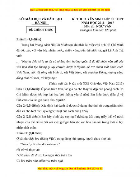 NĂM HỌC 2016 – 2017 Môn thi: NGỮ VĂN ĐỀ CHÍNH THỨC