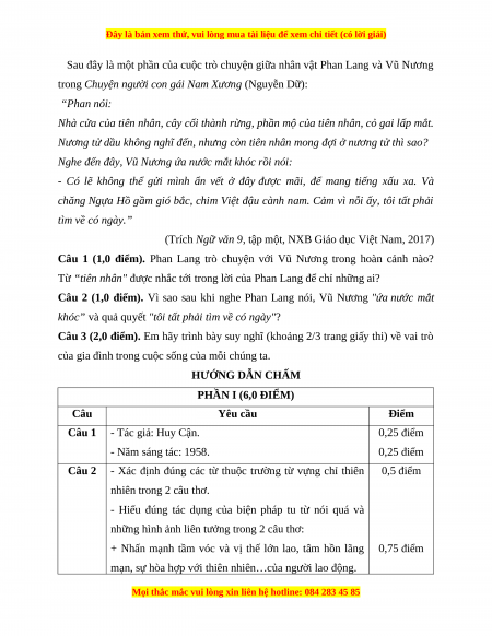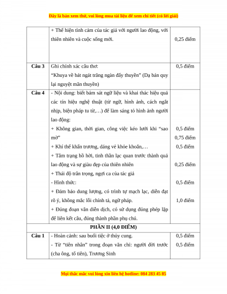 của gia đình trong cuộc sống của mỗi chúng ta. HƯỚNG DẪN CHẤM PHẦN I (6,0 ĐIỂM) Câu Yêu cầu Điểm Câu 1 - Tác giả: Huy Cận. 0,25 điểm - Năm sáng tác: 1958. 0,25 điểm Câu 2