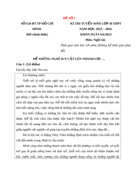 ĐỀ SỐ 1 S G Ở D-ĐT TP H C Ồ HÍ KÌ THI TUY N Ể SINH L P Ớ 10 THPT MINH NĂM H C Ọ 2023 – 2024 (Đ chí ề nh th c) ứ KHÓA NGÀY 6/6/2023 Môn: Ng văn ữ Th i