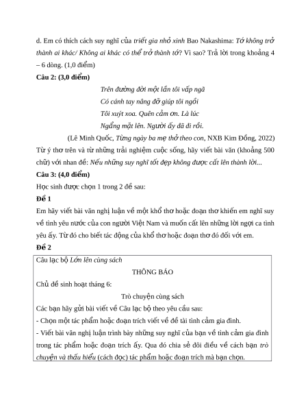 ữ suy nghĩ tốt đ p không ẹ đư c c ợ t ấ lên thành l i ờ ... Câu 3: (4,0 đi m ể ) H c ọ sinh đư c ợ ch n 1 t ọ rong 2 đ s ề au: Đ 1 ề Em hãy vi t ế bài văn nghị lu n ậ về m t ộ khổ th ơ ho c ặ đo n ạ th ơ khi n ế em nghĩ suy v t ề ình yêu nư c ớ c a ủ con ngư i ờ Vi t ệ Nam và mu n c ố t ấ lên nh ng l ữ i ờ ng i ợ ca tình yêu ấy. T đó cho bi ừ t ế tác đ ng c ộ a kh ủ ổ th ho ơ c ặ đo n t ạ hơ đó đ i ố v i ớ em. Đ 2 ề Câu l c b ạ ộ L n l ớ ên cùng sách THÔNG BÁO Chủ đ s ề inh ho t ạ tháng 6: Trò chuyện cùng sách Các b n ạ hãy g i ử bài vi t ế v C ề âu l c b ạ t ộ heo yêu c u s ầ au: - Ch n ọ m t ộ tác ph m ẩ ho c đo ặ n ạ trích vi t ế v đ ề t ề ài tình c m ả gia đình. - Vi t ế bài văn nghị lu n ậ trình bày nh ng ữ suy nghĩ c a ủ b n ạ v ề tình c m ả gia đình trong tác ph m ẩ ho c ặ đo n ạ trích y