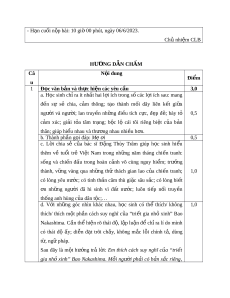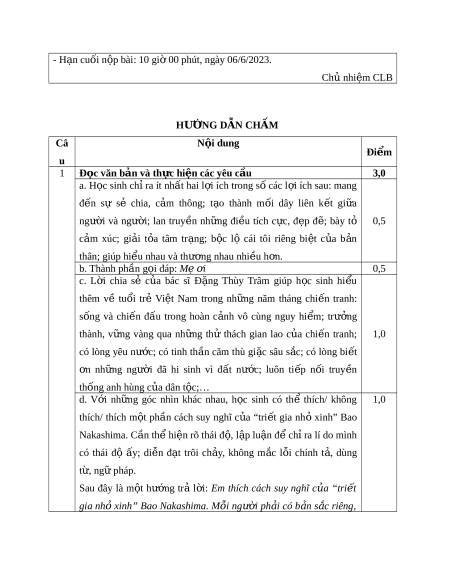 : 10 giờ 00 phút, ngày 06/6/2023. Chủ nhi m ệ CLB HƯ N Ớ G DẪN CHẤM Câ N i ộ dung Đi m ể u 1 Đ c văn b ọ ản và th c hi ự n các yêu c ệ u ầ 3,0 a. H c ọ sinh ch ỉra ít nh t ấ hai l i ợ ích trong s ố các l i ợ ích sau: mang đ n ế sự sẻ chia, c m ả thông; t o ạ thành m i ố dây liên k t ế gi a ữ ngư i ờ và ngư i ờ ; lan truy n ề nh ng ữ đi u ề tích c c, ự đ p ẹ đ ; ẽ bày tỏ 0,5 c m ả xúc; gi i ả t a ỏ tâm tr ng; ạ b c ộ lộ cái tôi riêng bi t ệ c a ủ b n ả thân; giúp hi u nhau và t ể hư ng nhau ơ nhi u h ề n. ơ b. Thành phần g i ọ đáp: Mẹ i ơ 0,5 c. L i ờ chia sẻ c a ủ bác sĩ Đ ng ặ Thùy Trâm giúp h c ọ sinh hi u ể thêm về tu i ổ trẻ Vi t ệ Nam trong nh ng ữ năm tháng chi n ế tranh: sống và chi n ế đ u ấ trong hoàn c nh ả vô cùng nguy hi m ể ; trư ng ở thành, v ng ữ vàng qua nh ng ữ thử thách gian lao c a ủ chi n ế tranh; 1,0 có lòng yêu nư c; ớ có tinh th n ầ căm thù gi c ặ sâu s c; ắ có lòng bi t ế n ơ nh ng ữ ngư i ờ đã hi sinh vì đ t ấ nư c; ớ luôn ti p ế n i ố truy n ề thống anh hùng c a dân t ủ c; ộ … d. V i ớ nh ng ữ góc nhìn khác nhau, h c