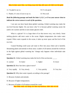 Question 21. Global warming may make the level of the sea become _____. A. warmer B. hotter C. higher D. lower