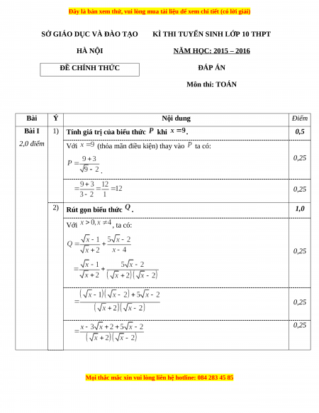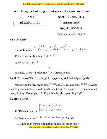 Đề chính thức Toán vào 10 Hà Nội năm 2015 - 2016