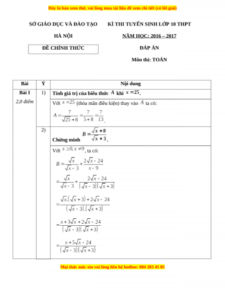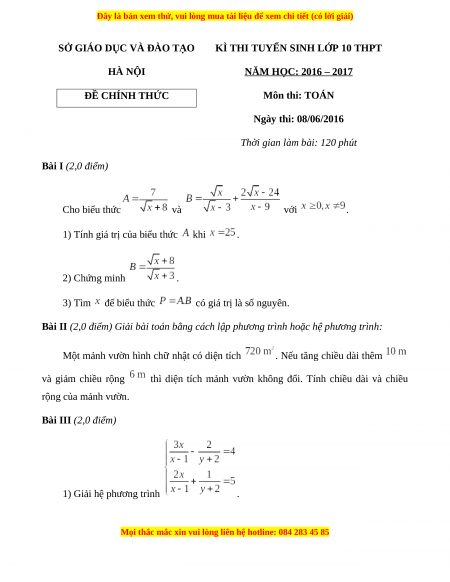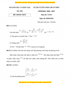 Đề chính thức Toán vào 10 Hà Nội năm 2016 - 2017