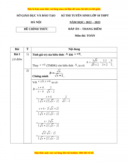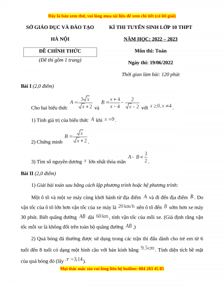 Đề chính thức Toán vào 10 Hà Nội năm 2022 - 2023