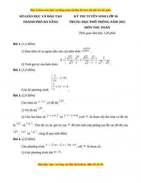Đề chính thức Toán vào 10 TP Đà Nẵng năm 2015 - 2016